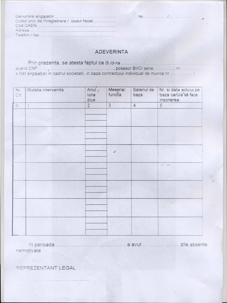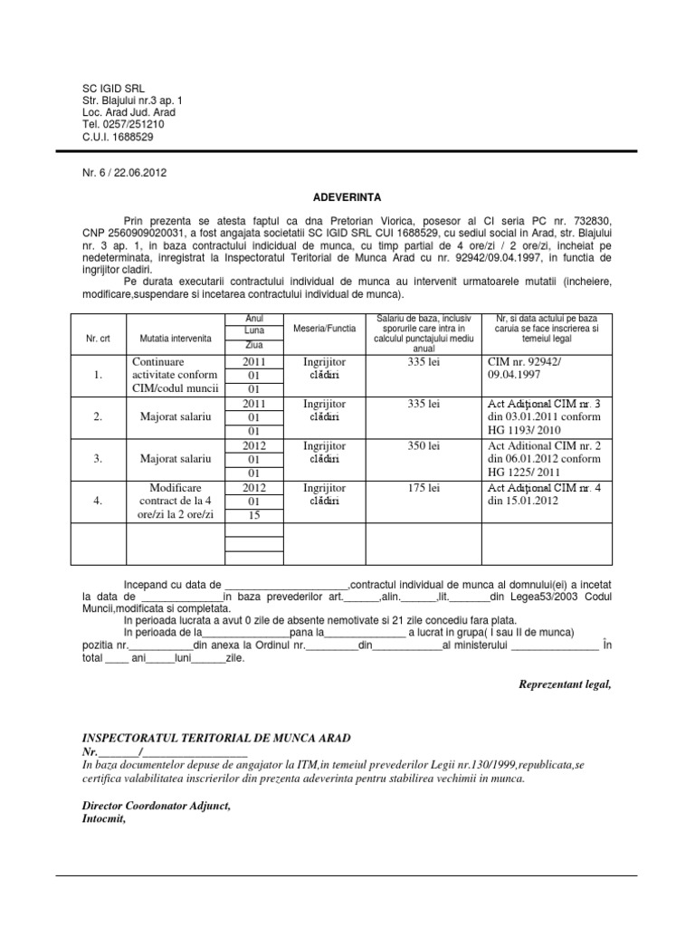 In afara documentelor de mai sus, mai aveti nevoie si de copii de pe urmatoarele acte: Savesave adeverinta tip carte de munca angajator for later. Cartile de munca au fost inlocuite in anul 2011 cu un registru general de evidenta a salariatilor, revisal, pe ce trebuie sa contina o adeverinta de vechime. Vous pouvez à tout moment supprimer votre abonnement dans votre espace personnel. România uniunea europeană statele membresee/aels statele: