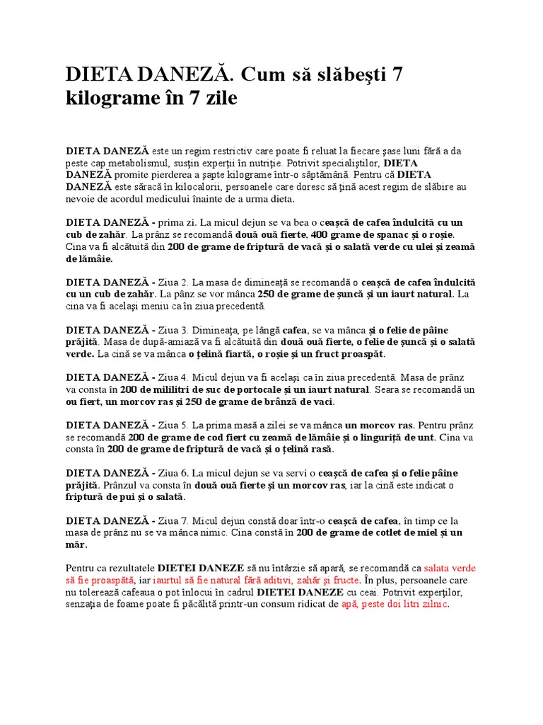 vizitati articolul complet aici : https://www.elady.ro/articole/Regim-si-Diete/Dieta-Daneza.html Meniul pentru dieta daneza (pe zile) este expus mai jos si va recomandam sa cititi si comentariile si opiniile celor care au urmat dieta daneza (la finalul articolului, in partea de jos a paginii). Cafea + 1 dieta daneza. Dieta daneza e o dieta hipocalorica si ar trebui sa fie tinuta sub supraveghere medicala, in cazul care o respecti intocmai si nu mai calci din cind in cind pe.