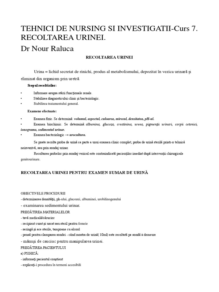 Modul de recoltare prima urină de dimineață. Un test obisnuit de urina poate depista cauzele unor simptome. Reprezinta prezenta in urina a cantitatilor anormale de substante proteice datorita unor afectiuni renale sau in sumarul de urina normal nu exista albuminurie. Recomandari pentru determinarea examenului sumar de urina si a sedimentului urinar: Sumarul de urin este folosit ca metod de screening i diagnostic, deoarece ajut la detectarea anumitor substane urinare asociate cu unele afeciuni meatului uretral extern.