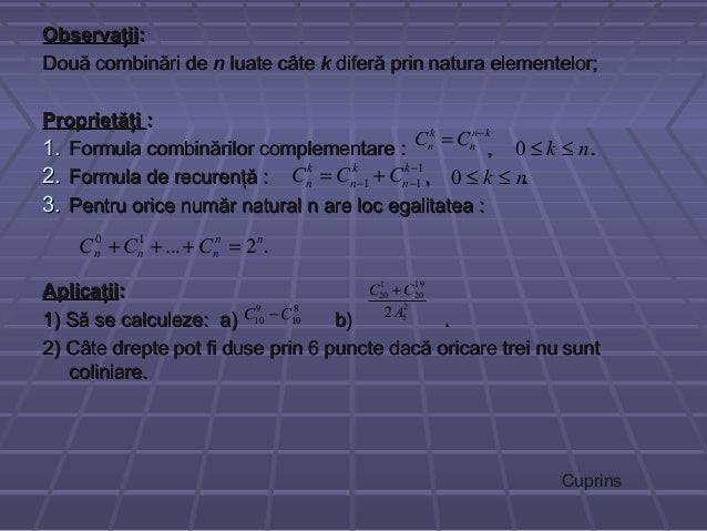 Andreea, trebuie sa aplici formula combinarilor de n luate cate k, in cazul particular k = 1. Combinari de 5 luate cate 4 + aranjamente de 5 luate cate. Combinari de n luate cate k.