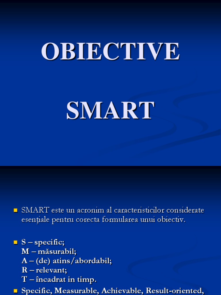 Anzari calitative sau vanzari cantitative? Carat concret ambitios realist acceptabil timp definit. Smart este un acronim al caracteristicilor considerate esenţiale pentru corecta formulare a unui obiectiv.